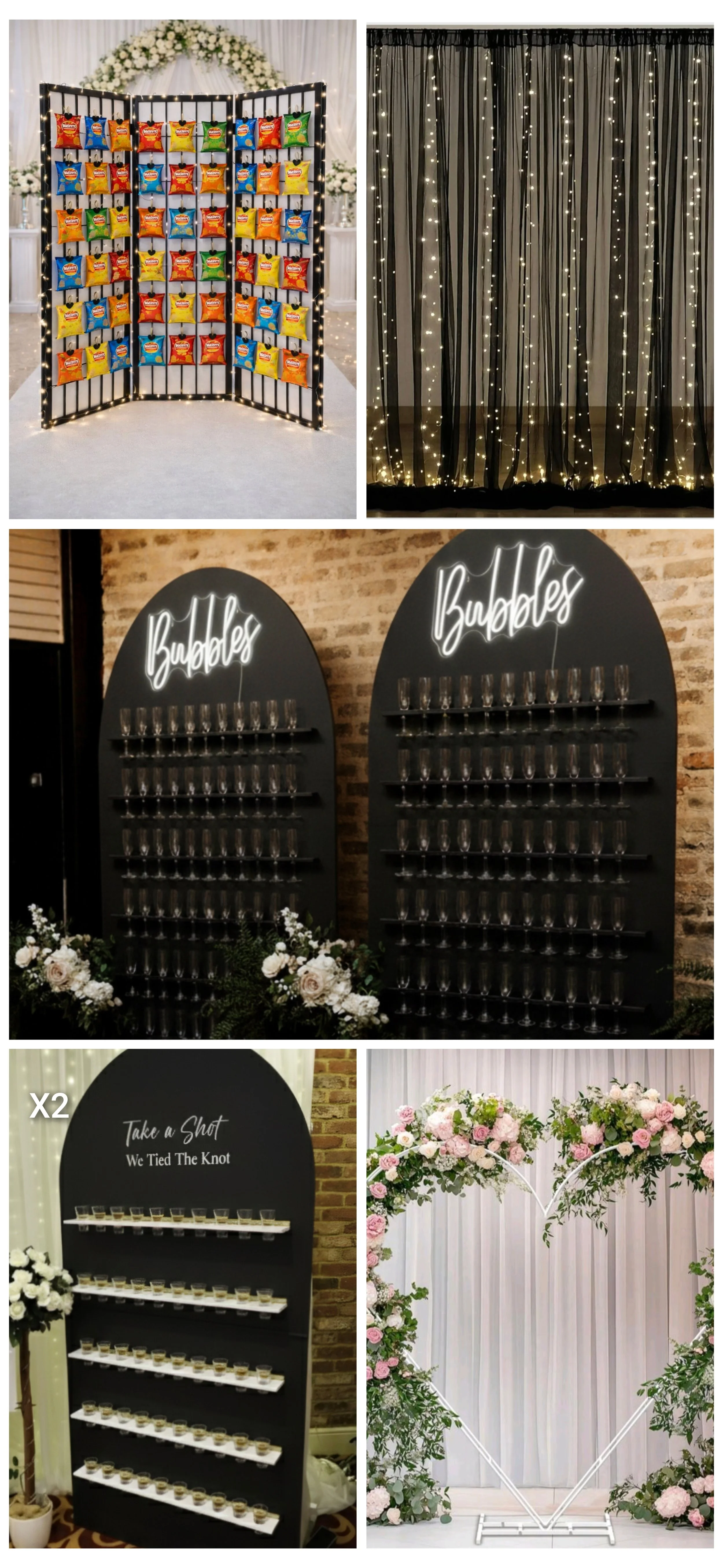 Elevate your event with The Event Table exclusive bundle deal, featuring two stunning champagne walls, two vibrant shot walls, a fully stocked crisp/sweet wall with pegs also a beautiful black curtain back drop that includes fairy lights and a breathtaking heart arch. Each drinks wall comes complete with stylish disposable glasses, creating a delightful experience for your guests. Perfect for weddings, parties, and corporate gatherings, our services ensure a chic and memorable celebration that aligns with our ethos of providing style or every event.