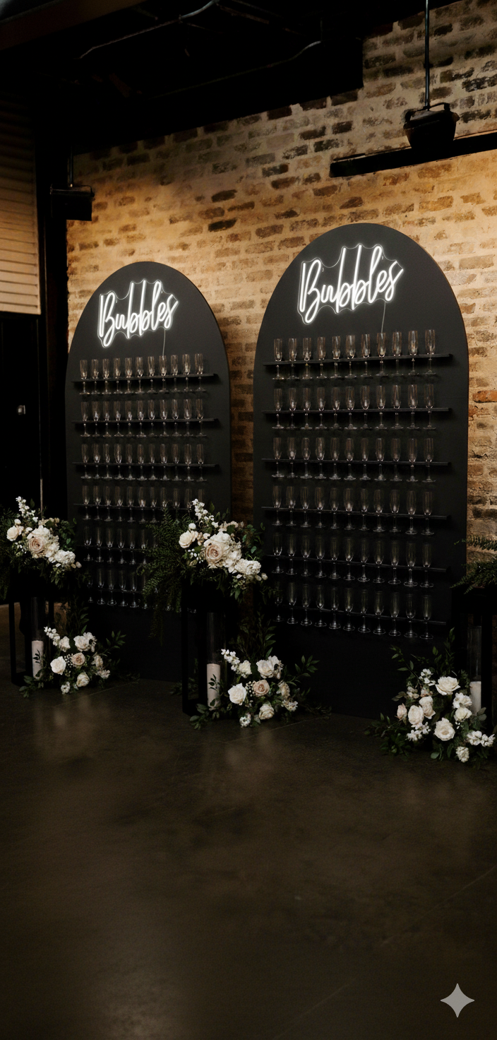 Elevate your event with our stunning champagne wall hire, complete with a vibrant neon Bubble sign. Available for 24-hour hire, each of our two walls accommodates up to 66 glasses and includes delivery and setup for your convenience. disposable champagne glasses included. Please note, alcohol/champagne are not included, allowing you to tailor your celebration perfectly.